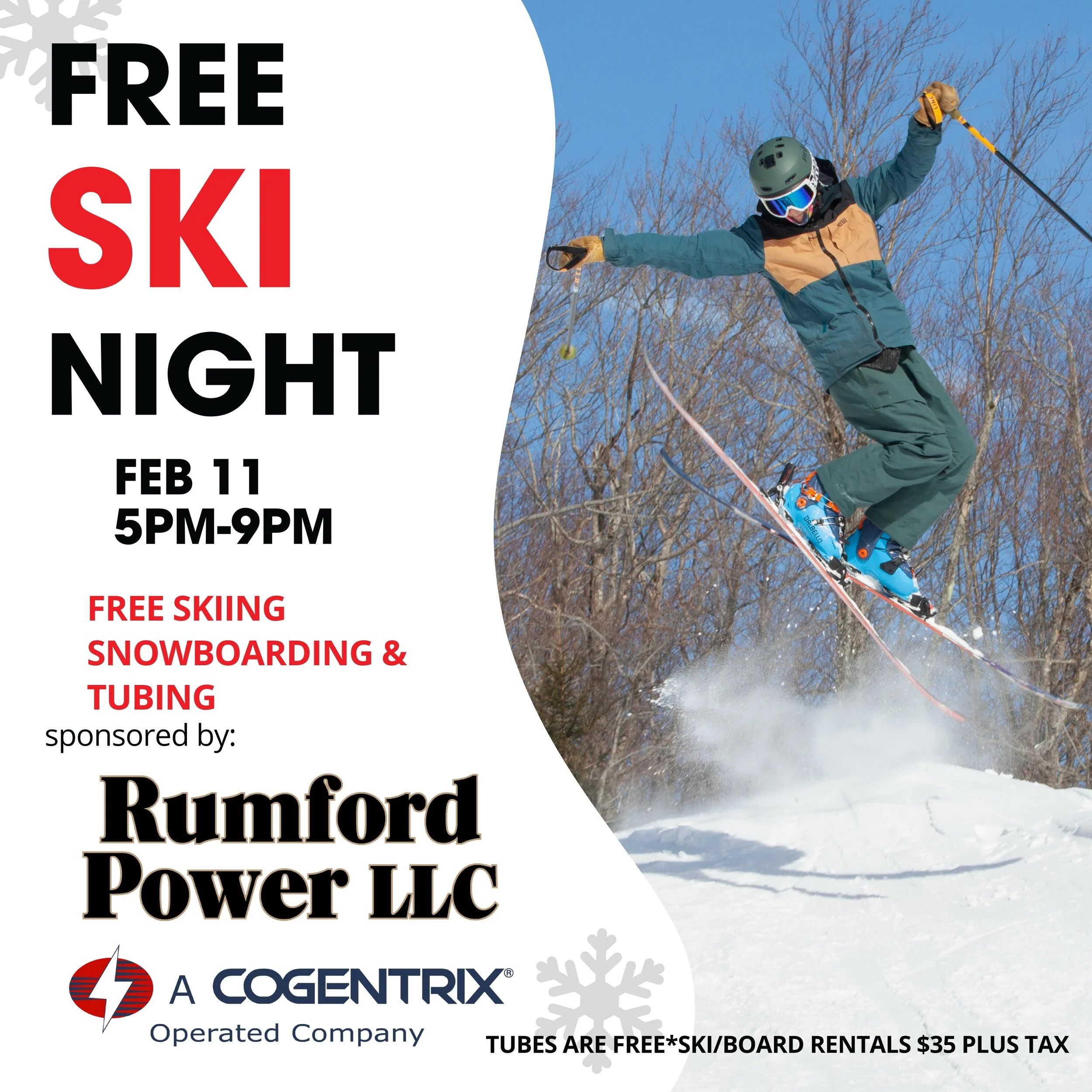 On February 11th join us for an unforgettable evening of fun on the slopes! From 5 PM to 9 PM, enjoy FREE skiing, snowboarding, and tubing*